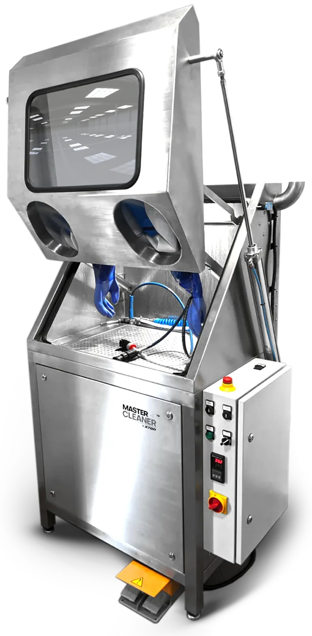 Workshop high-pressure washer constructed of AISI 304 stainless steel and AISI 316 acid-resistant steel dedicated to professional applications in wide industry. It works in a closed circuit at a temperature of 45°C. Cleaning efficiency is enhanced by XTON Active Cleaner fluid and properly adjusted temperature and pressure from the gun nozzle. Standard equipment includes a compressed air gun and a low-pressure overflow brush. The tank has a capacity of 90 liters. The chamber of the washer is pneumatically lifted and the adjustable height ensures comfortable use.