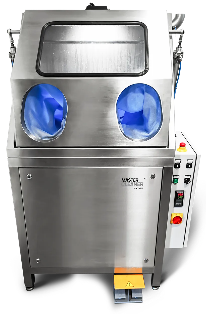 Workshop high-pressure washer constructed of AISI 304 stainless steel and AISI 316 acid-resistant steel dedicated to professional applications in wide industry. It works in a closed circuit at a temperature of 45°C. Cleaning efficiency is enhanced by XTON Active Cleaner fluid and properly adjusted temperature and pressure from the gun nozzle. Standard equipment includes a compressed air gun and a low-pressure overflow brush. The tank has a capacity of 90 liters. The chamber of the washer is pneumatically lifted and the adjustable height ensures comfortable use.